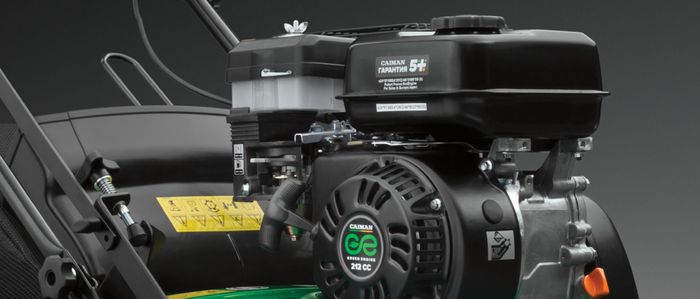 Соответствует новым европейским требованиям № 2016/1628 2019 года по уровню выброса вредных веществ. Модель оснащена экологичным двигателем Сaiman Green Engine 212СС премиум-класса с губчатым фильтром в масляной ванне, который отлично справляется с очисткой воздуха при сильно запыленных условиях. Чугунная гильза цилиндра и кованый коленвал обеспечивают стойкость к износу и длительный срок службы. За счет изменения угла наклона клапанов на 25˚ значительно увеличились забор воздуха, отвод выхлопных газов и мощность двигателя. Особая конструкция камеры сгорания повышает коэффициент сгорания топливной смеси, увеличивает мощность двигателя и уменьшает уровень выброса вредных веществ. Двигатель сертифицирован для использования в странах Европы и Японии и соответствует новым европейским требованиям 2019 года по уровню выброса вредных веществ.