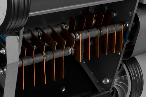 Система плавающих ножей Turn Comb. Рабочий орган аэратора представляет собой систему из 22 свободно вращающихся лезвий, размещенных на трехсекционном валу. Такая конструкция позволяет эффективно и безопасно проводить скарификацию газона, в том числе имеющего сложную структуру, без высокой нагрузки на двигатель и ножи.