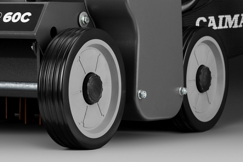 Колеса с каучуковым покрытием. Широкие колеса на двойных шарикоподшипниках гарантируют плавность хода и легкость перемещения по любым газонам.