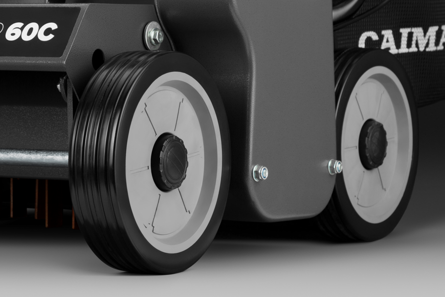 Прочные полимерные колеса оснащаются двойными влагостойкими подшипниками скольжения. Покрышки колес из натурального каучука повышают сцепление с дерном и комфорт работы.