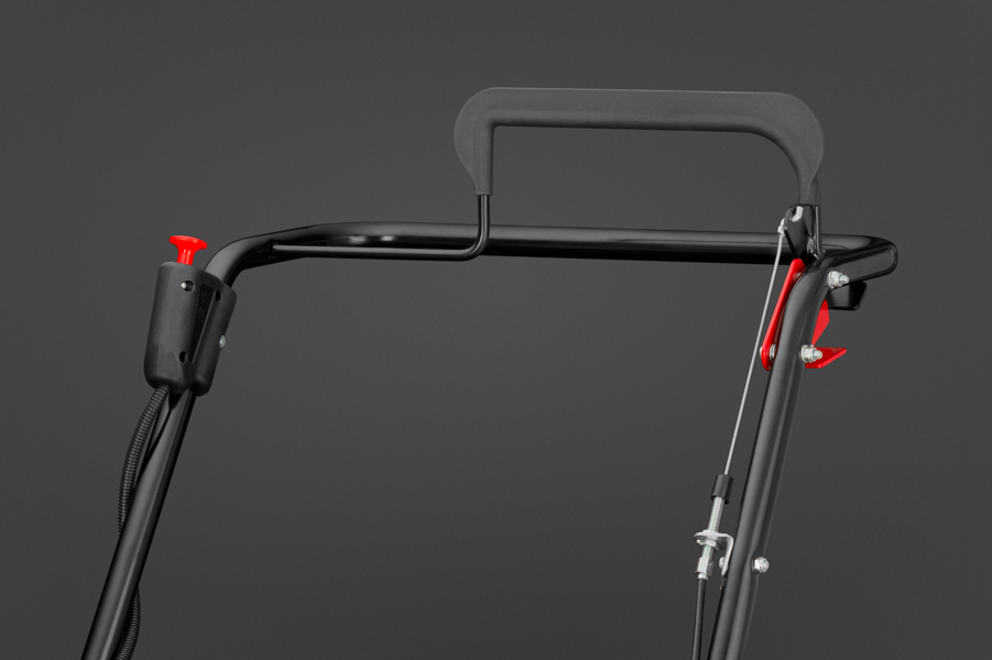 П-образная рукоять обеспечивает удобный хват даже при интенсивных маневрах. Рычаг включения привода ножей оборудован предохранительным механизмом для защиты от случайного запуска. На панели размещена отдельная кнопка отключения двигателя на случай необходимости экстренно остановить машину.