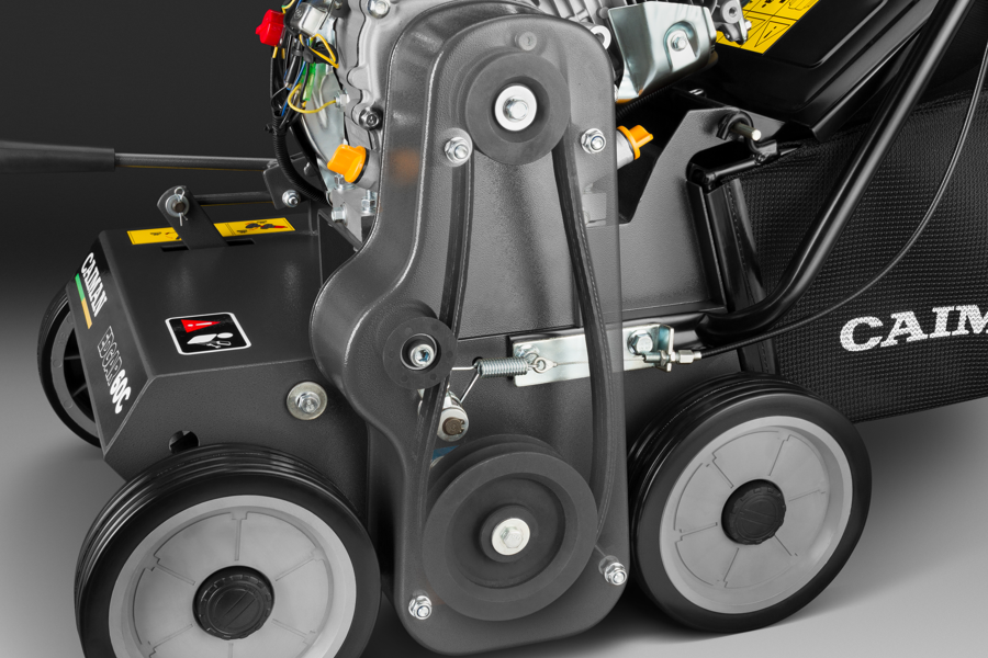 Двойной ременной привод ножей. Привод на ножи осуществляется с помощью двух ремней. За счет большей площади контакта крутящий момент эффективнее передается от двигателя на ножи. Зажимной шкив снабжен усиленной пружиной, выполняющей роль пассивного натяжителя ремня.