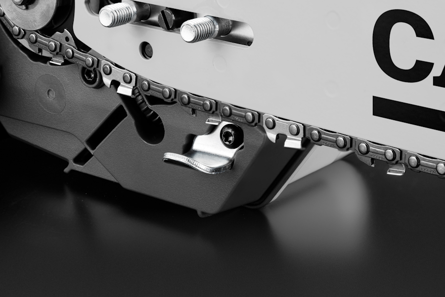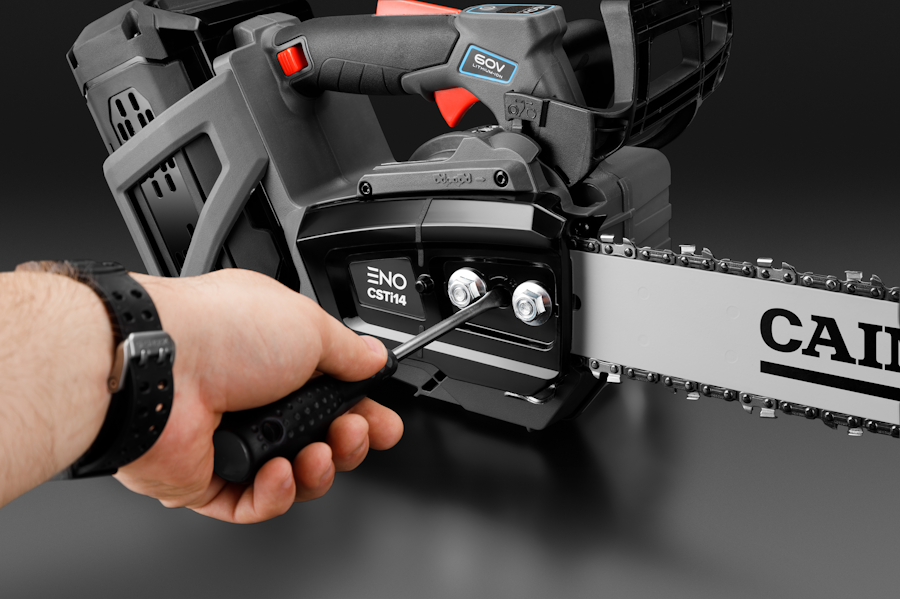 Винт регулировки натяжения цепи расположен сбоку, что дает возможность подтянуть или ослабить цепь, избегая контакта с ее режущими зубьями.