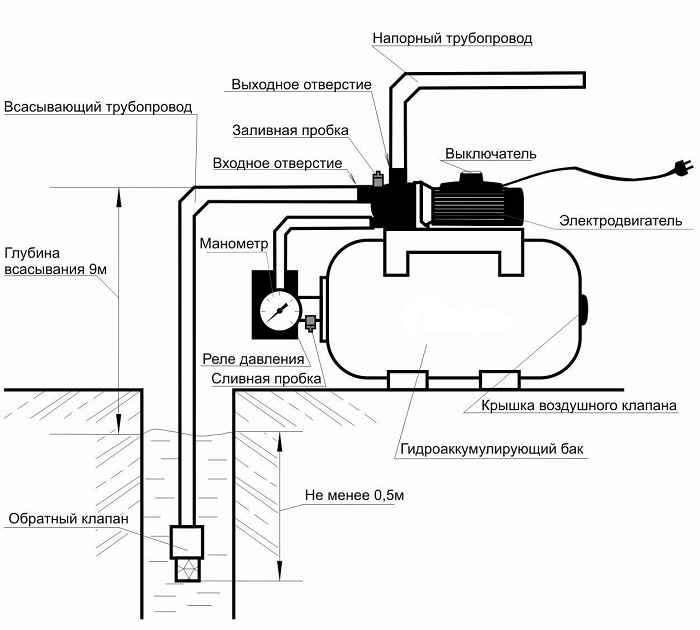 Электродвигатель насосной станции ВИХРЬ АСВ-600/20Н асинхронный, однофазный с короткозамкнутым ротором. Насос со встроенным эжектором сочетает преимущества центробежных с практичностью самовсасывающих насосов. Корпус насосной части изготовлен из стеклонаполненого полипропилена с закладными элементами из латуни для жесткости, а также чугуна и нержавеющей стали. Для исключения износа резьбовых соединений входное и выходное отверстия имеют металлическую резьбу. Гидроаккумулятор агрегата служит для аккумулирования воды под давлением и сглаживания гидроударов. Он состоит из стального резервуара со сменной мембраной и имеет пневмоклапан для закачивания сжатого воздуха.