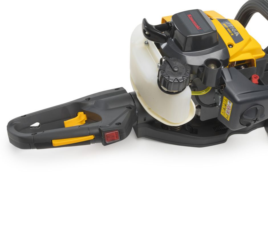 Бензиновый кусторез для живой изгороди с двухтактным двигателем объемом 22,5 куб. см и ножом с двусторонней заточкой длиной 75 см, рукояткой, вращающейся на 180° с тремя фиксированными позициями.