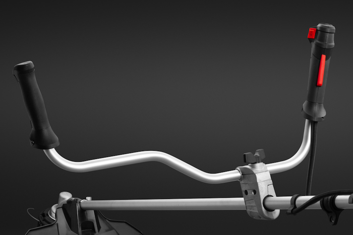 - Универсальная рукоятка управления. Бензокоса оснащена эргономичной рукояткой велосипедного типа с системой универсального управления, которая позволяет контролировать число оборотов двигателя и исключает случайное нажатие на курок газа. В экстренных ситуациях имеется возможность моментально заглушить двигатель.