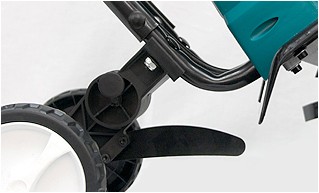 Удобная ручка для переноски и небольшие колеса, совмещенные с сошником, сделают работу на участке легкой и комфортной