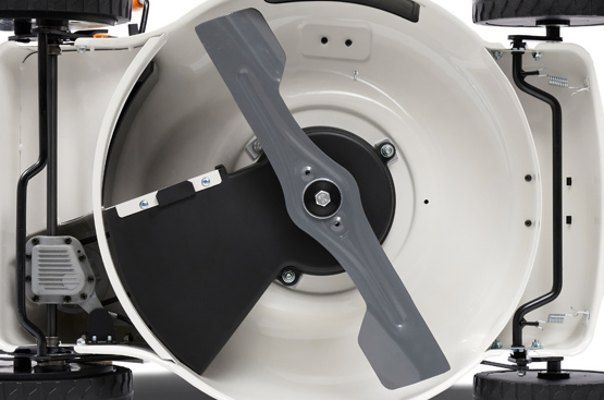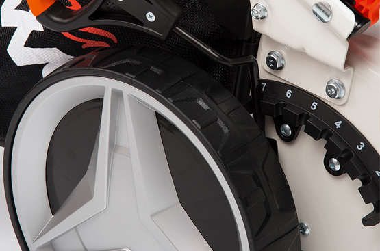 Настройка режущей деки производится в одно движение - путем смещения рычага, удобно расположенного на панели управления, который изменяет высоту подъема колес.