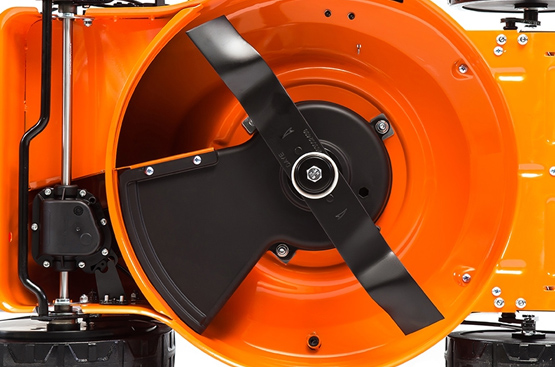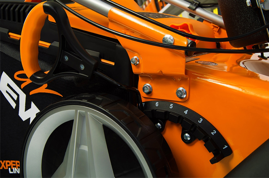 Центральная регулировка высота среза. Настройка режущей деки производится в одно движение - путем смещения удобно расположенного рычага, который одновременно изменяет высоту подъема передних и задних колес.