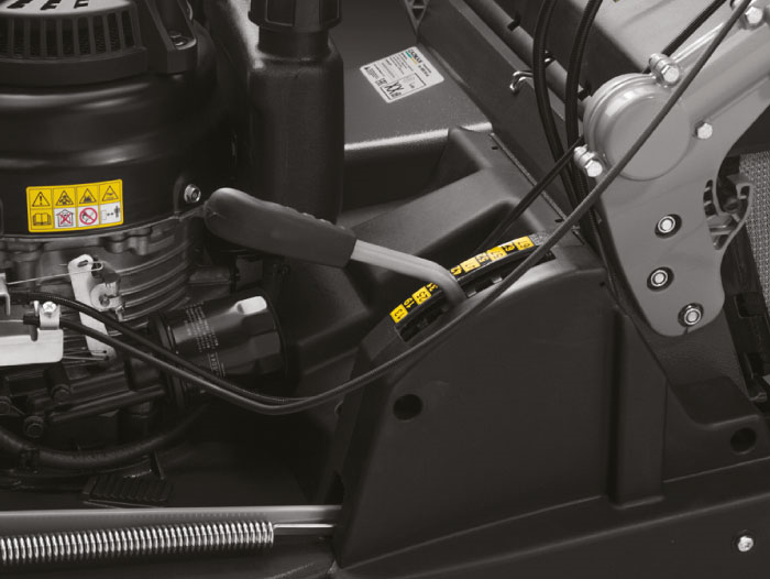 Привод на задний прижимной ролик газонокосилки осуществляется посредством 3-ступенчатой механической коробки передач, которая отличается высокой эффективностью и долгим сроком службы. Подобная конструкция идеально подходит для выполнения самых тяжелых работ в течение всего рабочего дня. Рычаги управления скоростью движения удобно расположены на рукоятке газонокосилки.