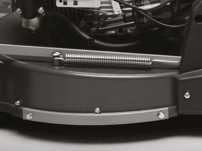 Стальная защита внешней и внутренней части косильной деки может заменяться по мере необходимости. Она предотвращает повреждение внутренней части деки камнями и другими предметами, а также защищает внешнюю часть при кошении вблизи стен или других объектов.