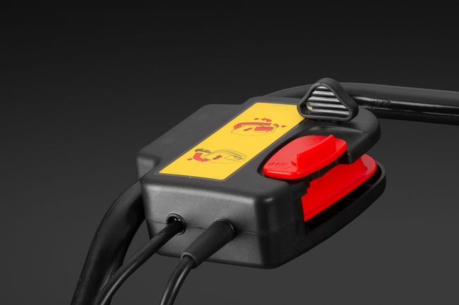 Рукоятка снабжена специальным предохранительным механизмом для защиты от случайного запуска газонокосилки посторонними людьми. Прежде чем начать работу, необходимо вставить специальный ключ в верхнюю часть панели запуска, а затем нажать на кнопку блокировки, чтобы вытащить рычаг включения.