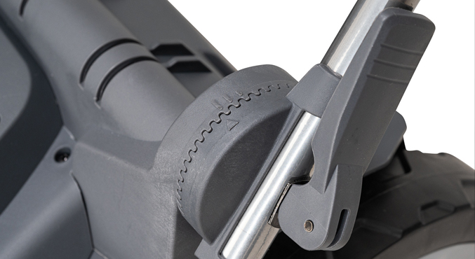 Регулировка положения всех 4-х колес одним рычагом позволяет мгновенно перенастроить высоту скашивания в зависимости от потребности. Металлический привод обеспечивает четкость при переключении режимов. В период активного роста травы возможно устанавливать низкую высоту скашивания для увеличения интервала между кошениями. При жаркой погоде, а также в конце сезона, рекомендуется устанавливать большую высоту скашивания, чтобы избежать выгорания травы.