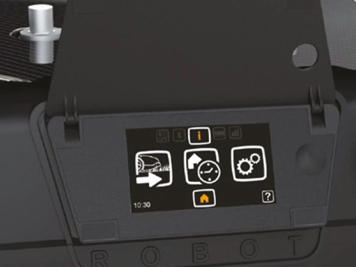 Полноцветный сенсорный дисплей имеет простой и интуитивно понятный интерфейс, позволяющий легко программировать робота-газонокосилку и управлять им. Справка (знак «?»), расположенная в правом нижнем углу экрана, помогает оператору выводить на экран русскоязычное описание любого раздела меню.