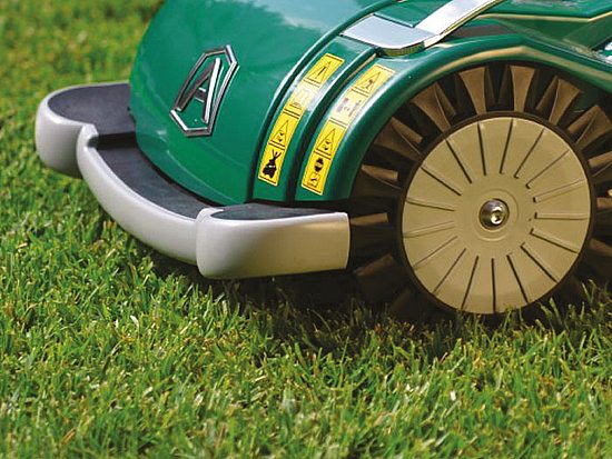 По краям корпуса робота расположены четыре колеса небольшого диаметра, закрепленные на подвижных рычагах. При резком перепаде высоты, когда хотя бы одно из этих колес опускается ниже уровня, у робота моментально срабатывает датчик края газона: машина останавливается и меняет траекторию движения на противоположную.