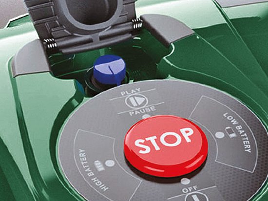Кнопка "STOP" позволяет моментально прекратить работу робота. В таком случае практически моментально останавливаются нож и колеса. Модель оборудована новым удобным портом для быстрой зарядки.