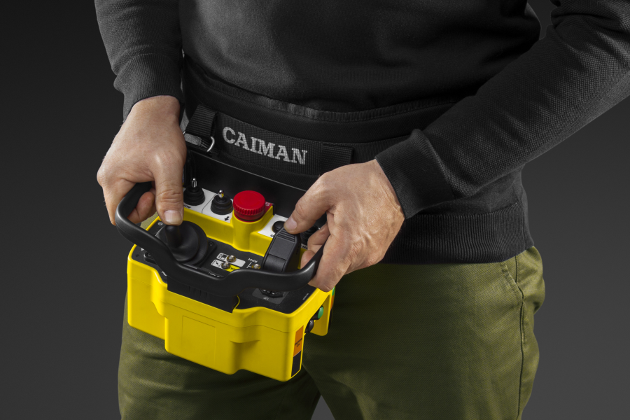 Управление машиной Caiman Commando осуществляется с помощью пульта радиоуправления. Для освоения навыков управления машиной не требуется долгое обучение. Профессиональные джойстики позволяют предельно точно управлять машиной на безопасном расстоянии до 150 метров вдали от шума, пыли и выхлопных газов. Устройство крепится к поясу оператора с помощью удобной эргономической подвески. Отличается высокой степенью защиты: радиоуправление устойчиво к перепадам напряжения, ударопрочный корпус защищен от влаги и пыли, степень защиты IP65.