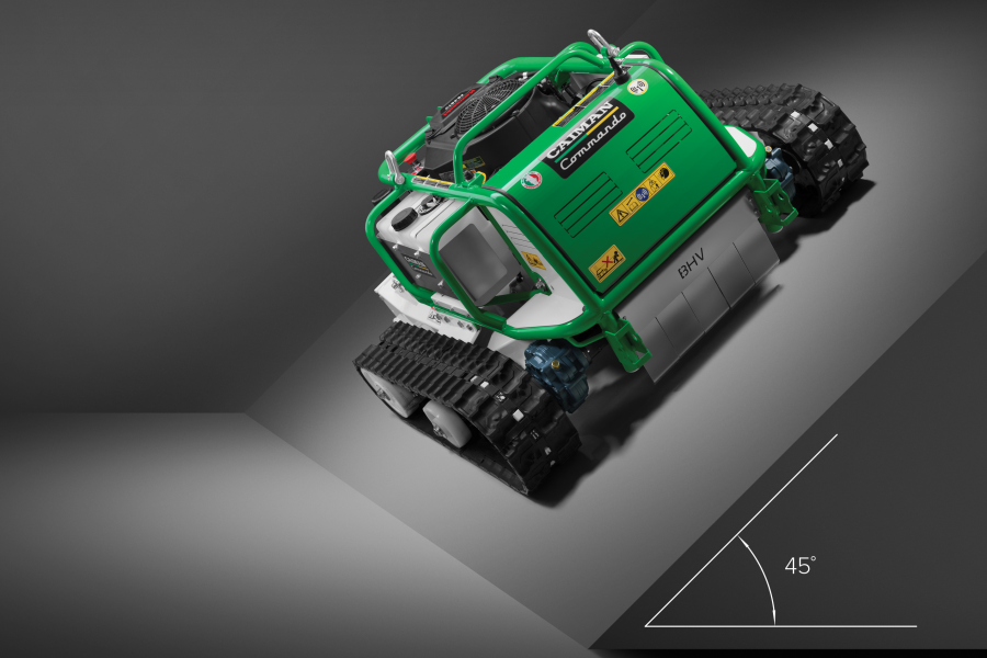 Низкий центр тяжести машины (15 см) позволяет эффективно работать на склонах до 45°, что существенно расширяет возможности использования машины в труднодоступных местах. При работе на склонах не требуется разворот машины – с помощью переключателя можно легко изменить направление движения в обратную сторону. Траки малого размера обеспечивают равномерное давление на грунт и не повреждают газон при повороте.
