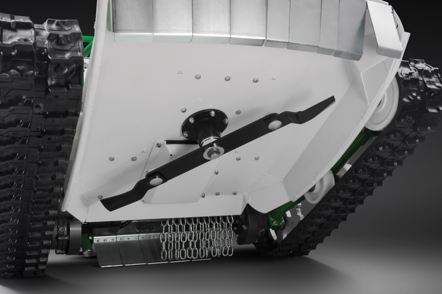Специальный нож деки из высокопрочной стали позволяет без проблем скашивать бурьяны и небольшие кустарники (высотой до 1 метра). А электрический привод исключает повреждение приводного вала при попадании ножа на камень или металлические предметы. Вал просто остановится в магнитном поле. Центральное расположение косильной деки дает большую безопасность для оператора и окружения во время работы машины.