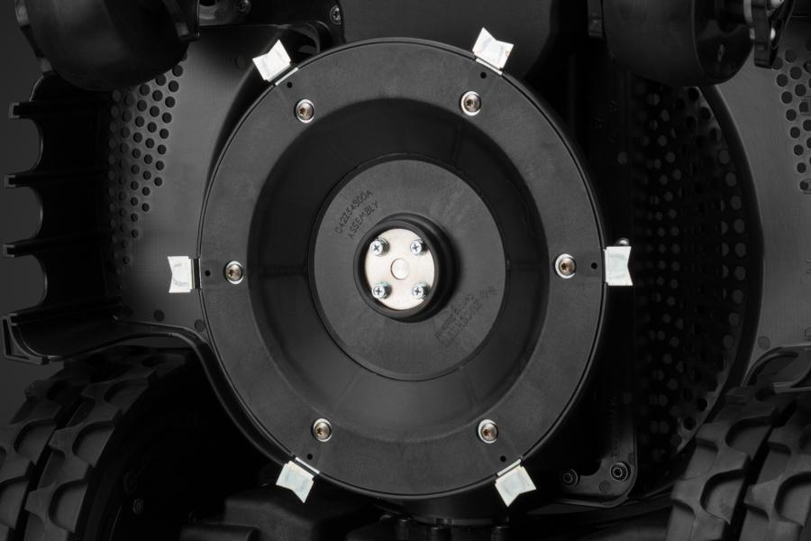 Перфорированный корпус и воздушный поток, образуемый вращающимся ножом, создают эффект самоочистки, удаляя частицы травы с робота.
