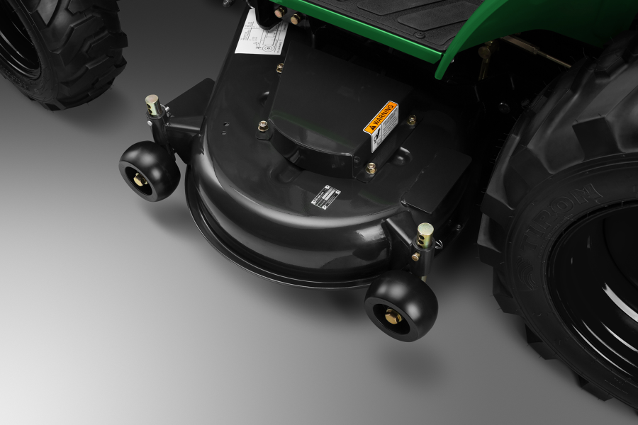 Усиленная режущая дека с боковым выбросом и большой шириной кошения располагается между осями, что позволило сместить центр тяжести ближе к середине машины. Это улучшило устойчивость при работе на территориях со сложным ландшафтом и большими перепадами по высоте. Приводные узлы и крепления деки просты в обслуживании и имеют высокий запас прочности для интенсивной коммерческой эксплуатации.