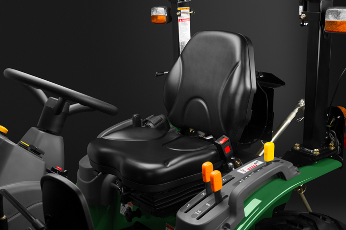 Удобное сиденье оператора оснащено высокой спинкой и ремнями безопасности для защиты оператора при помощи рамы ROPS. Кресло регулируется в положении вперед/назад и позволяет работать длительное время без усталости.