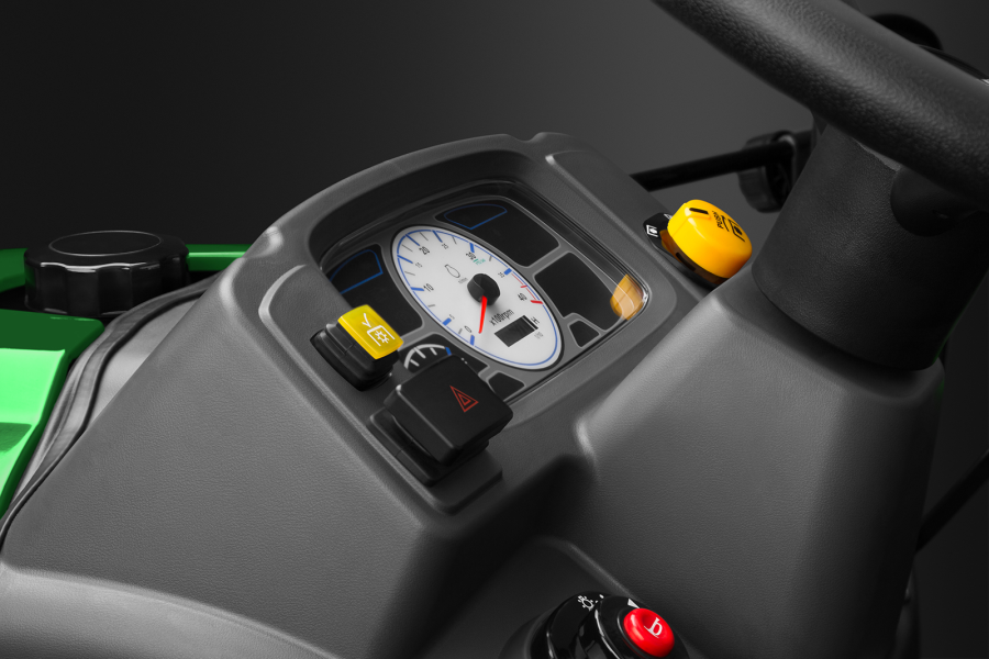 Конструкторы CAIMAN Dako уделили особое внимание комфорту оператора. На информационной аналоговой панели находится вся необходимая информация: счетчики моточасов и оборотов двигателя, индикатор включенной деки и уровня топлива.