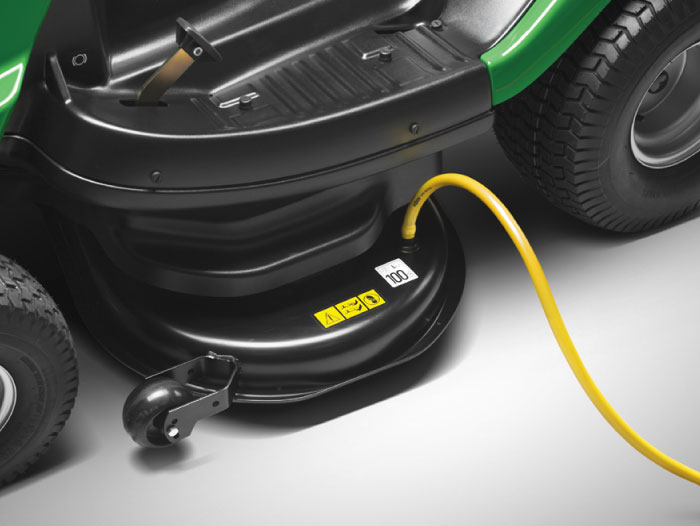 Газонокосильная дека оборудована системой очистки внутренней поверхности. Для этого достаточно подключить к штуцеру на деке обычный садовый шланг с водой. После включения привода ножей мойка начнется автоматически.
