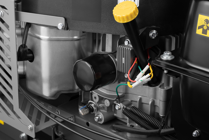 В отличие от обычных газонокосилок, где смазка трущихся частей производится разбрызгиванием, система смазки под давлением позволяет эффективнее распределять масло внутри двигателя. Это снижает риск перегрева, особенно при интенсивных нагрузках и работе в жаркие дни, а также делает возможной работу на поверхностях с углом наклона, недоступным для обычных газонокосилок.