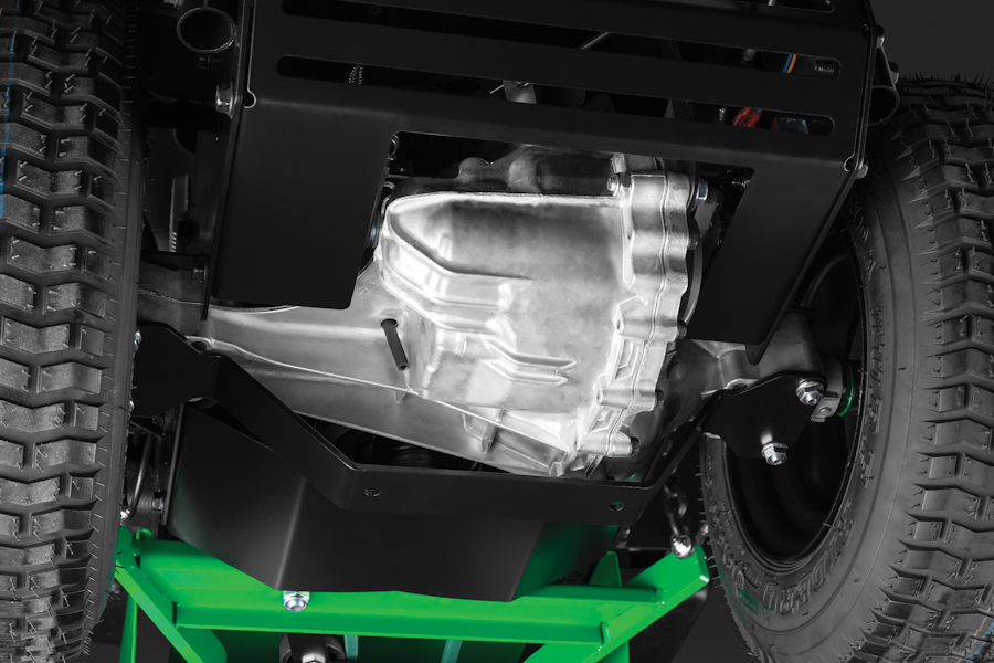 Гидростатическая трансмиссия в отличие от механической коробки имеет более компактные размеры, обеспечивает плавное изменение скорости и направления движения, исключает необходимость переключения передач и увеличивает маневренность машины. Система блокировки дифференциала уменьшает пробуксовку колес и обеспечивает надежную сцепку с поверхностью даже в сложных условиях работы. Это защищает газон от повреждений.