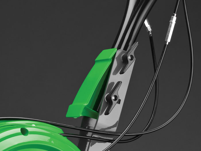 Прочное откидывающееся транспортировочное колесо помогает переместить машину до места хранения или в рабочую зону. Удобство при передвижении обеспечивается за счет переднего расположения колеса и отлично сбалансированной конструкции самого культиватора.