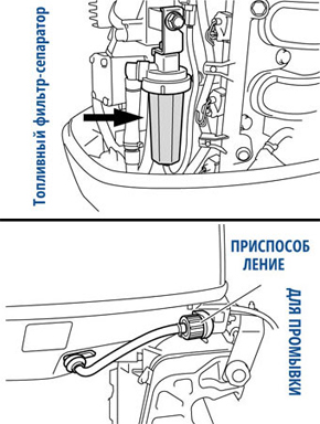 Порт для промывки системы охлаждения располагается сбоку на поддоне подвесного мотора. Подключив через шланг напор пресной воды из водопроводной системы, можно без труда промыть каналы охлаждения двигателя.