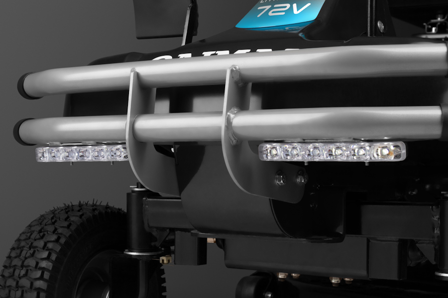 Питание электрооборудование получает от литий-ионного аккумулятора емкостью 18 А*час, напряжением 72 В. Батарея данной конструкции не имеет эффекта памяти, способна быстро заряжаться и поддерживать стабильное число оборотов двигателя при любом уровне заряда. К плюсам садового райдера так же относят возможность регулировать высоту кошения травы, наличие двух функций: сбора растительной срезки в травосборник и бокового выброса, круиз-контроля, регулируемого кресла оператора.