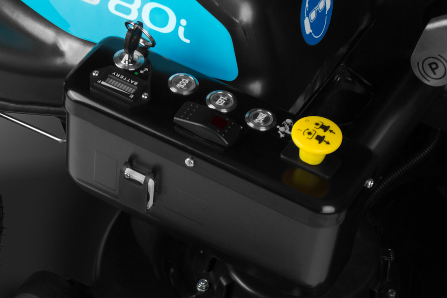 Инструментальная панель, расположенная справа под рукой оператора, вмещает все необходимое для контроля над машиной: индикатор заряда аккумулятора, замок зажигания, кнопки: привода режущей деки, круиз-контроля, RMO (кошение задним ходом), фар, смены направления движения. Функция круиз-контроля позволяет зафиксировать скорость движения, чтобы не удерживать педаль в нажатом положении. Для включения круиз-контроля достаточно нажать кнопку СCS и можно отпускать педаль акселератора. Для отключения этой функции достаточно нажать на педаль тормоза или акселератора.