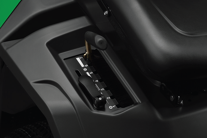 Дека имеет 7 установленных положений регулировки высоты кошения в диапазоне от 25 до 80 мм. Рычаг регулятора находится под рукой оператора и защищен стопорным механизмом во избежание случайного переключения.