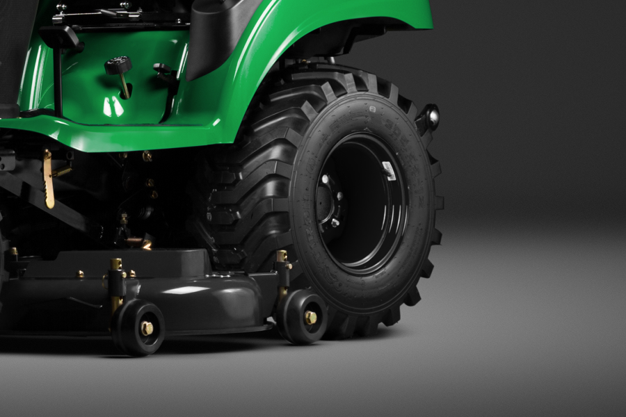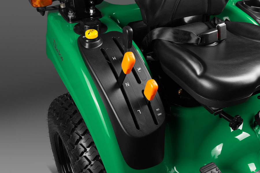 Инновационная гидростатическая трансмиссия имеет два режима скоростей, позволяя выбирать наиболее оптимальный режим в зависимости от сложности территории. С помощью отдельного рычага можно быстро переключиться между задним (2WD) и полным приводом (4WD). В особо сложных условиях можно заблокировать задний дифференциал, чтобы обеспечить одинаковый привод на задние колеса и улучшить управляемость машины.