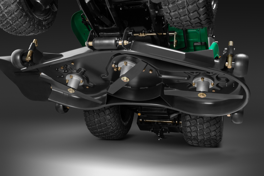 Усиленная дека с боковым выбросом шириной кошения 137 см оснащена тремя мощными ножами и разработана для самых тяжелых условий эксплуатации. Инновационная форма деки с перегородками управления потоком создает мощное аэродинамическое движение измельченной травы внутри конструкции, что обеспечивает высокую скорость и отличное качество стрижки. Цельнометаллический усиленный адаптер ножа надежно защищает коленвал двигателя от возможных повреждений: при попадании на посторонние предметы нож проскальзывает по оси. Межосевое расположение деки позволило сместить центр тяжести ближе к середине машины, что улучшило ее устойчивость при работе на территориях со сложным ландшафтом и большими перепадами по высоте. Приводные узлы и крепления деки просты в обслуживании и имеют высокий запас прочности для интенсивной коммерческой эксплуатации.
