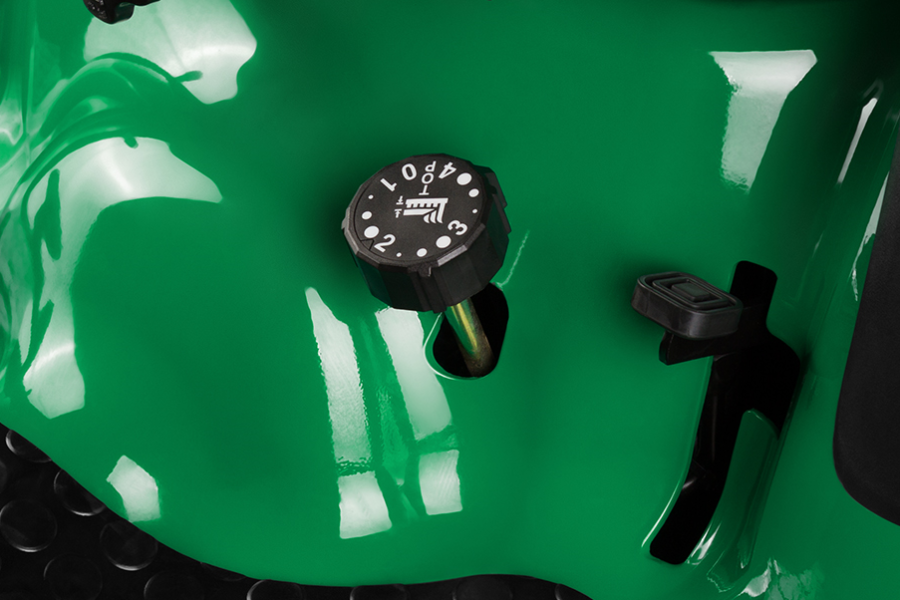Высота ножей регулируется поворотной ручкой, позволяющей точно выставить нужный уровень стрижки. Подъём и опускание деки производится с помощью отдельного гидравлического привода, активируемого рычагом. Для работ на неровном газоне и исключения скальпирования дерна декой опорные колеса регулируются отдельно.