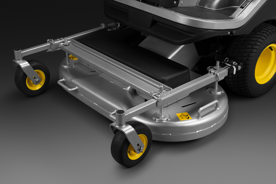 Дека с плавающим механизмом кошения состоит из двух частей: режущих дисков с плавающими ножами и специального подъемного механизма. Плавающие ножи позволяют сберечь приводные узлы в случае столкновения с посторонними предметами на газоне: при ударе они откидываются в центр диска, а затем возвращаются в рабочее положение под действием центробежной силы. Плавающий режим обеспечивает качественный результат кошения даже на неровных участках.