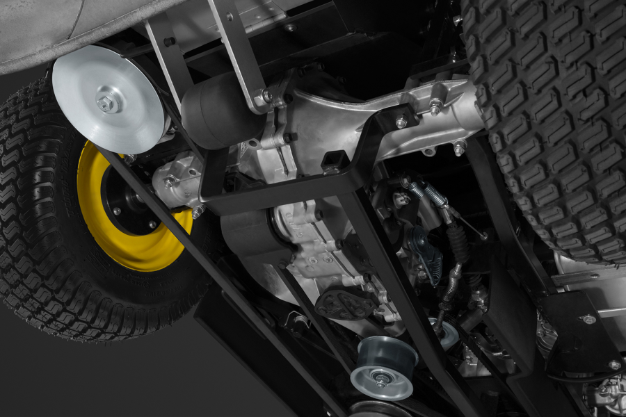 Привод на передние колеса осуществляется при помощи мощной гидростатической трансмиссии с высоким крутящим моментом. Управление скоростью движения машины – простое, без применения механизмов переключения передач, посредством одной педали. Демпфер обеспечивает плавность торможения и смены направления движения. Трансмиссия оснащена гидравлической системой фильтрации масла, что гарантирует ее стабильную работу даже при интенсивных нагрузках. Дополнительный стальной каркас надежно защищает трансмиссию и другие элементы подвески от возможного столкновения с бордюрами, камнями, корнями деревьев.