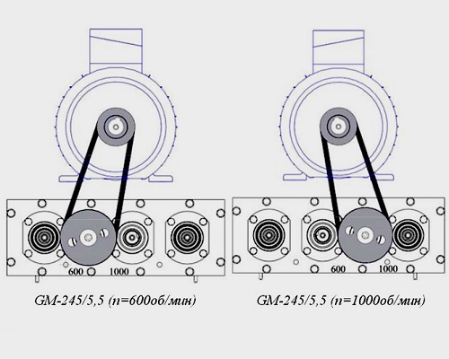 - На мозаично-шлифовальной машине GM-245 (5.5) имеется возможность изменения частоты вращения с 600 об./мин на 1000 об./мин, и наоборот за счёт перестановки шкива с одного вала на другой.