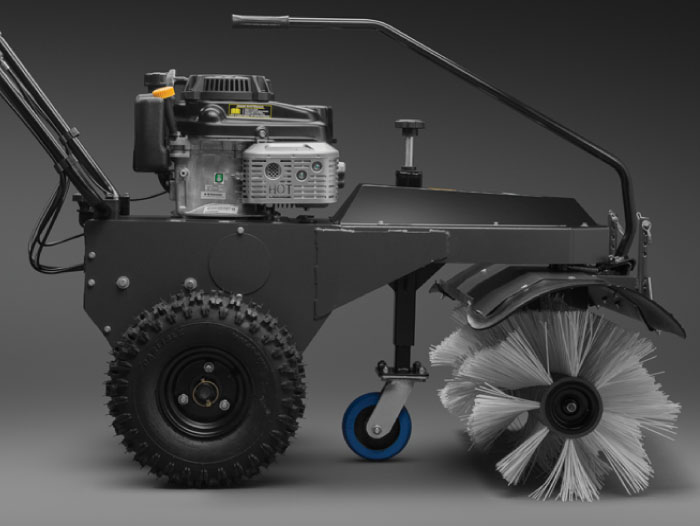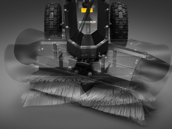 Подметальная машина Caiman Giro 800K имеет профессиональную двухременную систему привода щетки. Уровень прижатия щетины к асфальту осуществляется в зависимости от условий работы: от уборки сухой пыли и до уборки тяжелого мокрого снега. Регулировка позволяет оптимально настроить положение щетки в зависимости от направления сметания грязи (2 положения вправо, 2 положения влево, прямо)