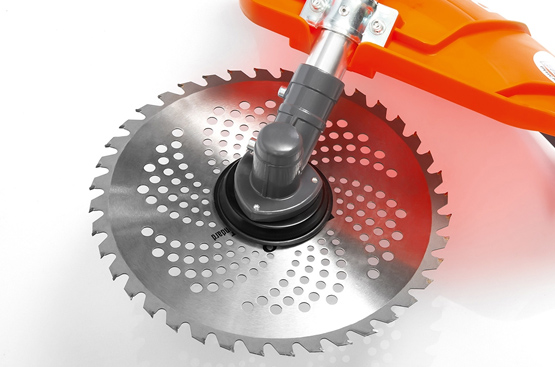 Режущий диск изготовлен из высокопрочной стали с твердосплавными напайками. 40 зубьев позволяют использовать его для кошения жесткой травы, кустарника и тонких стволов деревьев.