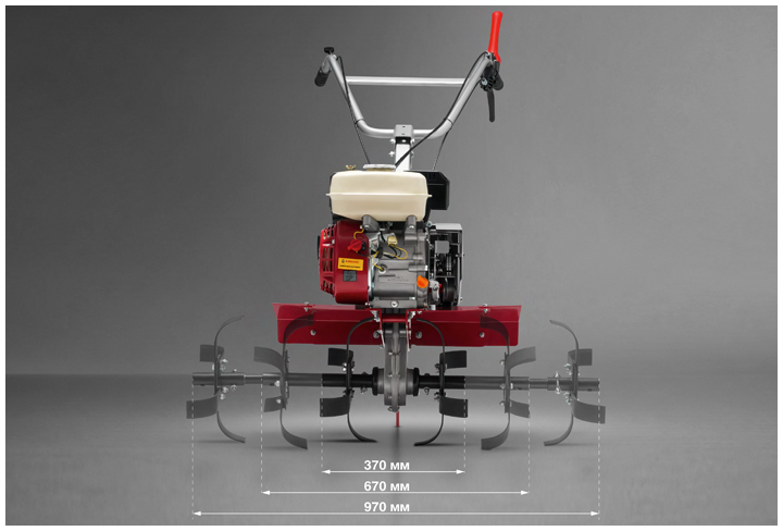 Уникальная конструкция фрезы мотокультиватора Мобил К МКМ-1Р дает возможность культивировать почву с разным захватом – 370, 670, 970 мм. Это позволяет обрабатывать большие участки гораздо быстрее, а также делают удобной работу в небольших клумбах, междурядье и на участках со сложной конфигурацией. Также в базовой комплектации такой фрезы идут диски защиты растений. С ними захват увеличивается до 450, 750, 1050 мм. Что немаловажно, фреза состоит не из трех одинарных секций, а из одной двойной и одной одинарной.