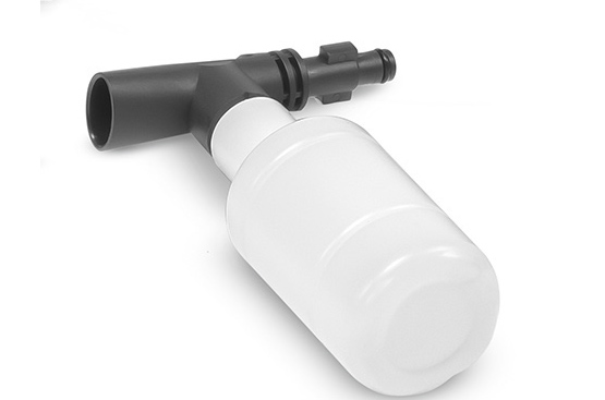 Специальная насадка на пистолет с резервуаром для жидких моющих средств позволяет экономично и быстро наносить пену на очищаемую поверхность.