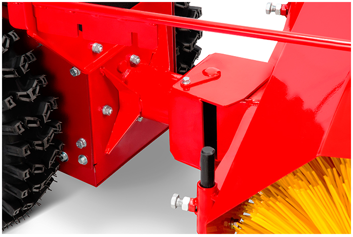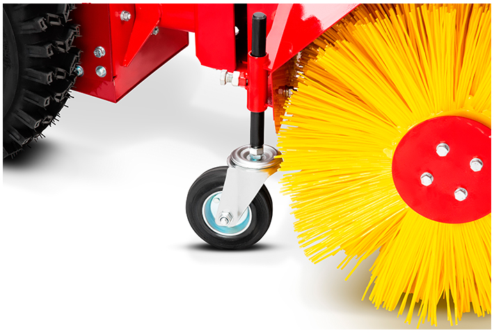 Благодаря специальным опорным колеса в конструкции управлять и поворачивать подметальной машиной легко и комфортно. Также при помощи этих колес можно отрегулировать уровень прижатия щетки к поверхности под разные типы загрязнений, которые необходимо убирать.