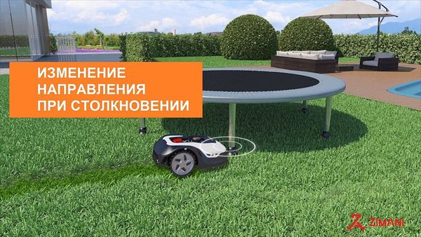 Роботизированная косилка оснащена датчиком столкновения. В случае отключения ультразвуковых датчиков или не распознания препятствия, газонокосилка автоматически меняет направление движения при столкновении. Кроме этого, режущие ножи расположены далеко от края корпуса. Поэтому при встрече с препятствием газонокосилка-робот остановится и поменяет направление движения, не причиняя вреда другим объектам.