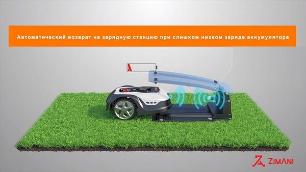 Когда разряжается аккумуляторная батарея, роботизированная газонокосилка автоматически возвращается на зарядную станцию.