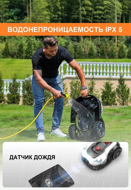 Робот-косилка может быть непосредственно промыт водой из шланга, максимальное давление воды не более 0,5 МПа. Газонокосилка ZimAni разработана для функционирования в различных погодных условиях без дополнительного вмешательства человека, устойчива к воздействию осадков и может находиться в Вашем саду на протяжении всего сезона стрижки.