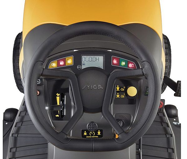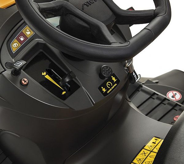 Садовый трактор оснащен функцией круиз-контроля (управляется кнопкой), которая дает возможность настраивать фиксированную скорость движения для экономии топлива.